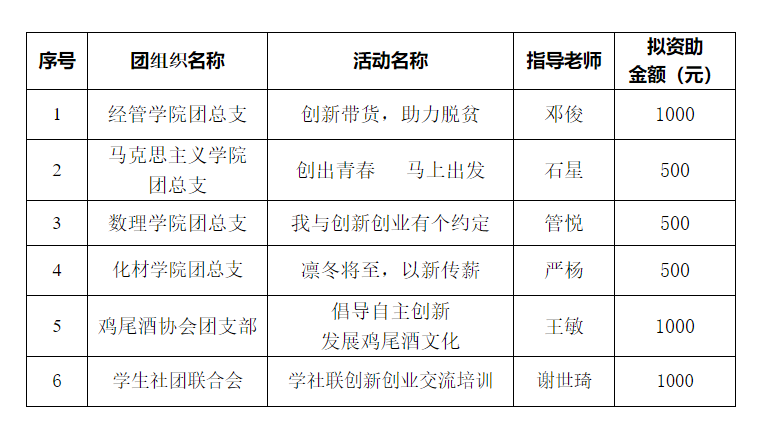 根据《关于开展湖南文理学院2020年“团在行动·创出青春”主题团日活动的通知》,经各学院团总支和学生社团团支部自主申报,创新创业学院和团委审核,对“创新带货,助力脱贫”等6个主题团日活动予以立项,通报如下。