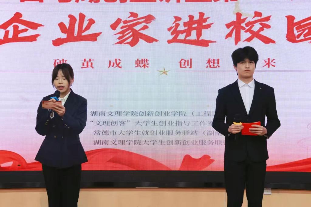为深化校企合作,搭建校企交流桥梁,助力青年学子明晰职业方向、汲取成长力量。2026年3月17日星期二下午3点,我校于图书馆报告厅隆重举办“企业家进校园”活动。本次活动由湖南文理学院创新创业学院主办,“文理创客”大学生创业指导工作室、常德市大学生就创业服务驿站(湖南文理学院)和大学生创新创业服务联盟承办,特邀考德上教育集团董事长田亚东先生莅临现场,以“创业,痛并快乐着”为主题,与到场学生展开深度对话与分享,并由创盟讲师团成员金顺,焦小桃担任主持人。